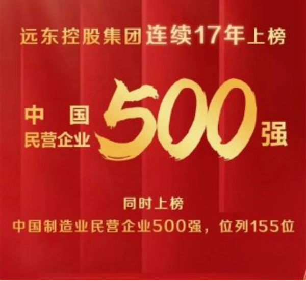 全国工商联与山东省人民政府共同举办以“坚定发展信心 推动高质量发展”为主题的“2023 中国民营企业 500 强峰会暨全国优强民营企业助力山东绿色低碳高质量发展大会”在济南隆重召开。远东控股集团连续17年上榜中国民营企业500强。同时,上榜中国制造业民营企业500强,位列155位。